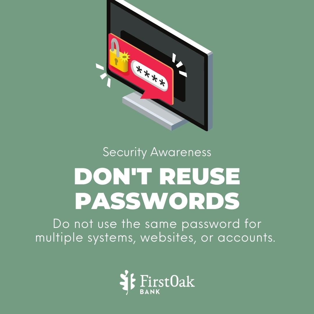 Do you use the same password for all of your banking accounts, website logins, social media, etc? Would you use the same key for your car, home, office and safe? Consider changing your password on different websites including FirstOak Bank’s Online Banking!